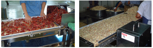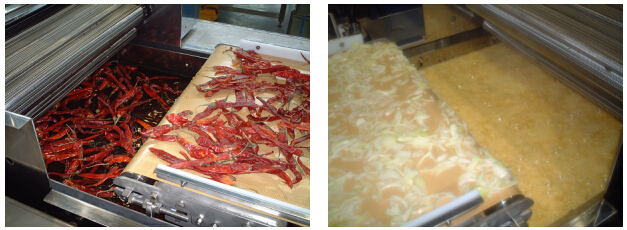 投入洋蔥、辣椒、大蒜等蔬菜等,數秒鐘后,浮出油面、排擠油,經由過程傳遞帶送進來